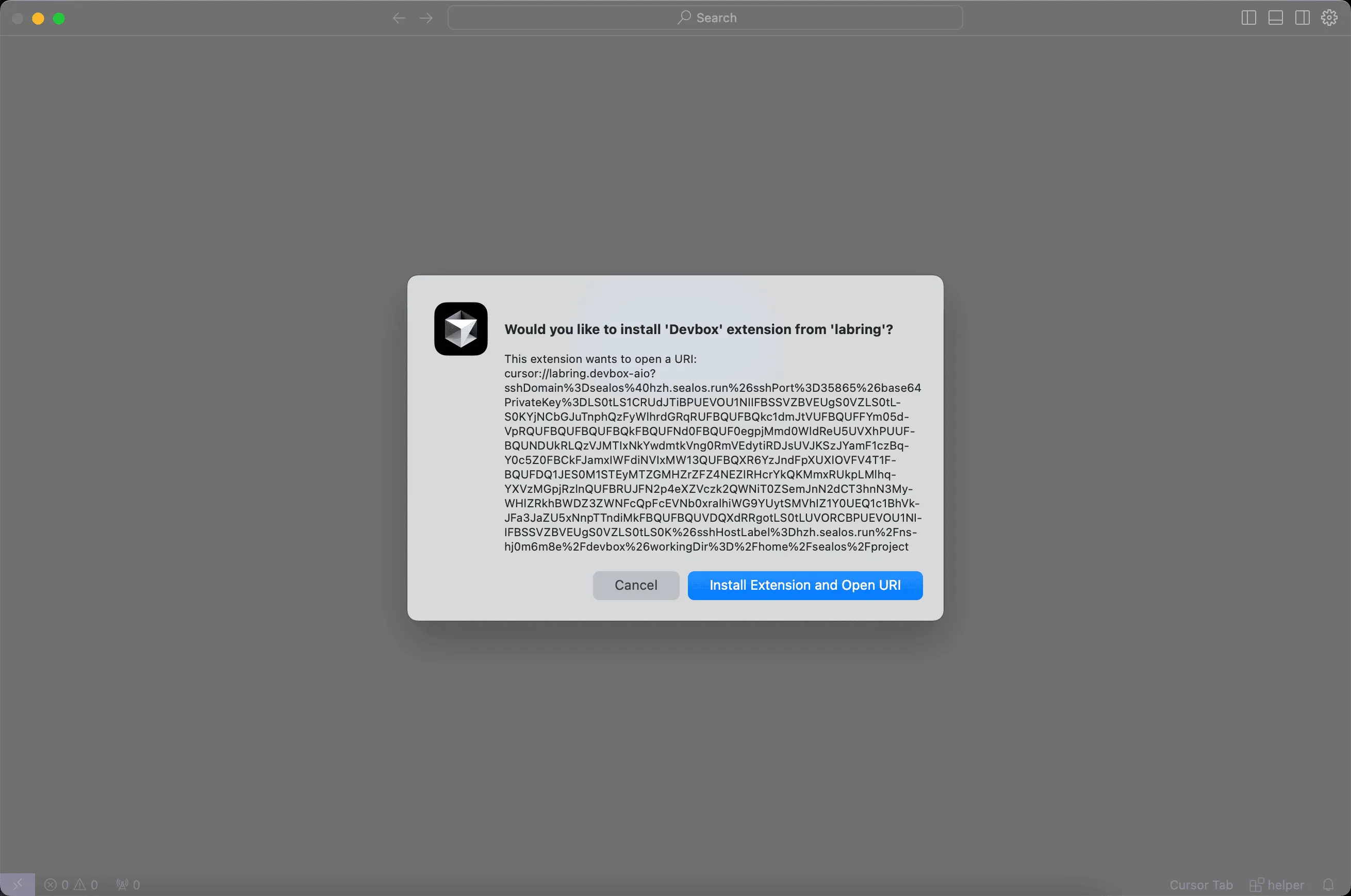 点击 Open Cursor 后,将自动打开本地的 Cursor 编程工具。再点击 Install Extension and Open URI,安装必备插件。