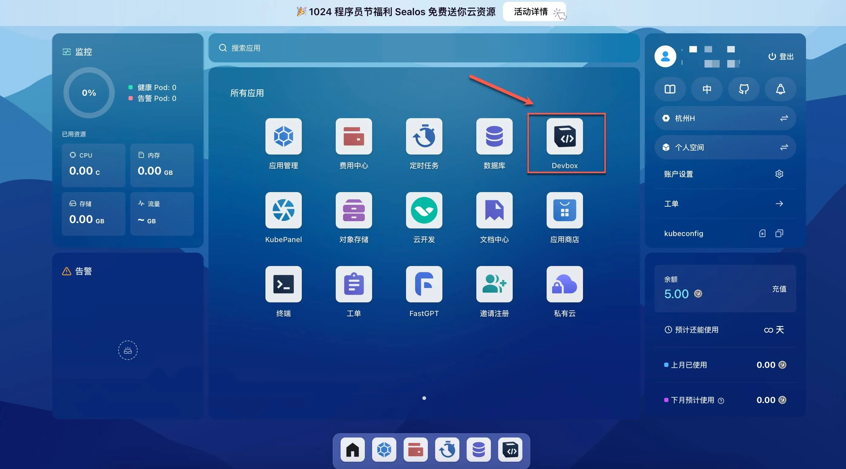 第一步,注册并登录 Sealos,登录完成后,进入首页,点击 Devbox。
