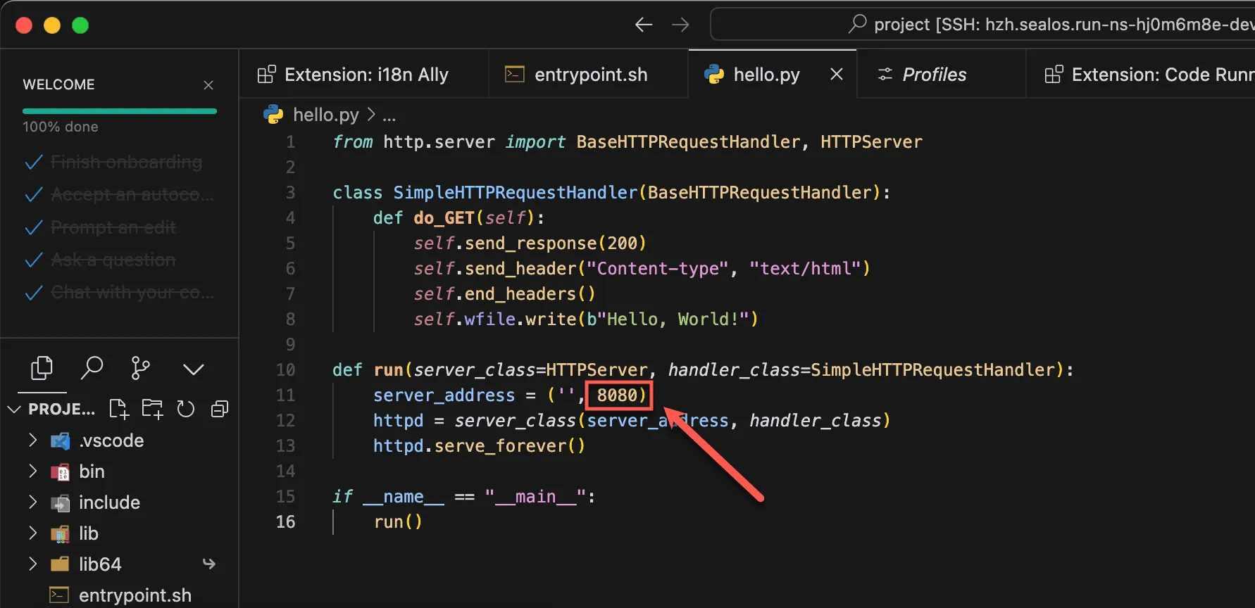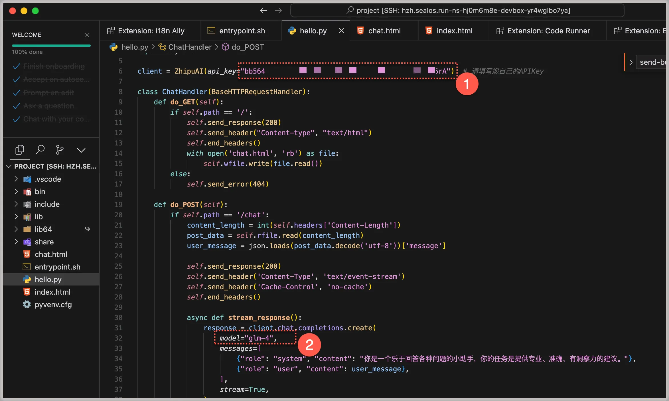 在绑定了 Devbox 项目的 Cursor 界面,我们看到了初始化的代码结构。接下来,我们演示如何启动代码。