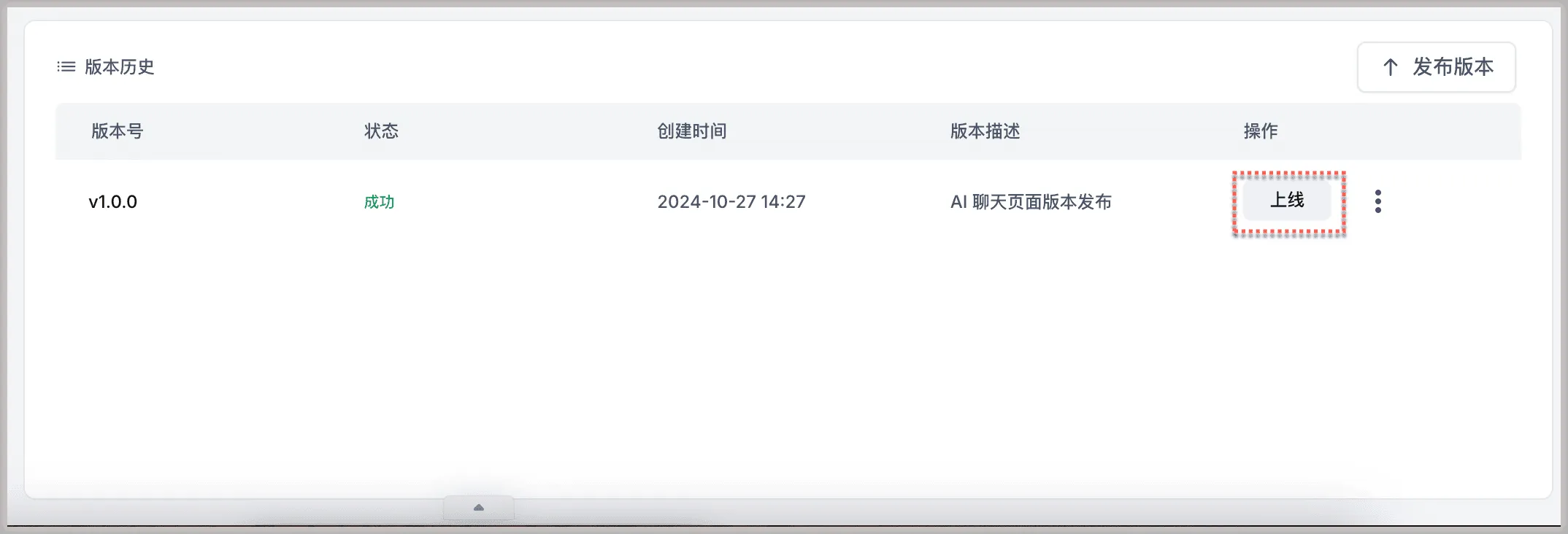 稍等片刻,在版本历史界面点击 上线,将跳转到正式环境的配置界面。