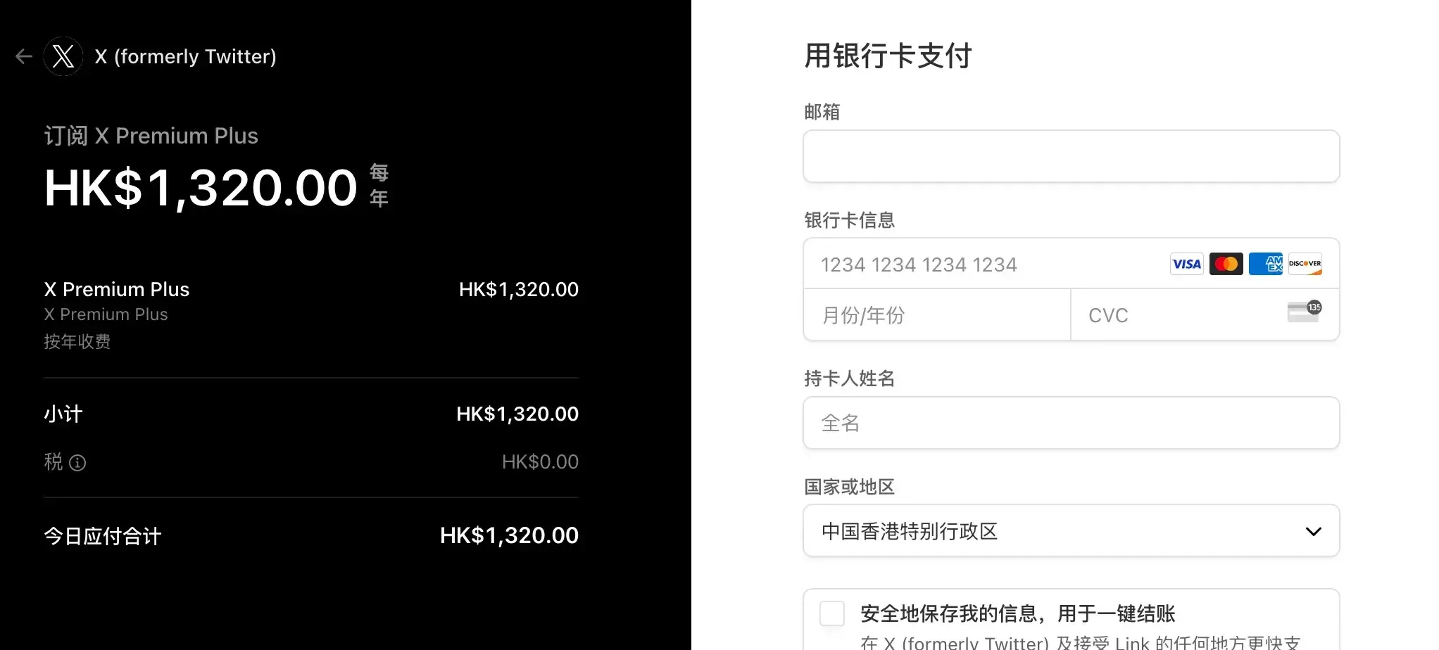 如果你拥有 VISA 卡,开通过程非常简单。只需在 Twitter 菜单中找到 premium 选项,选择个人支付,进入支付页面即可: