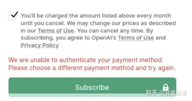 如果在尝试订阅时出现提示:We are unable to authenticate your payment method.,这通常是因为不支持国内的支付方式。你可以通过以下两种方法进行升级: