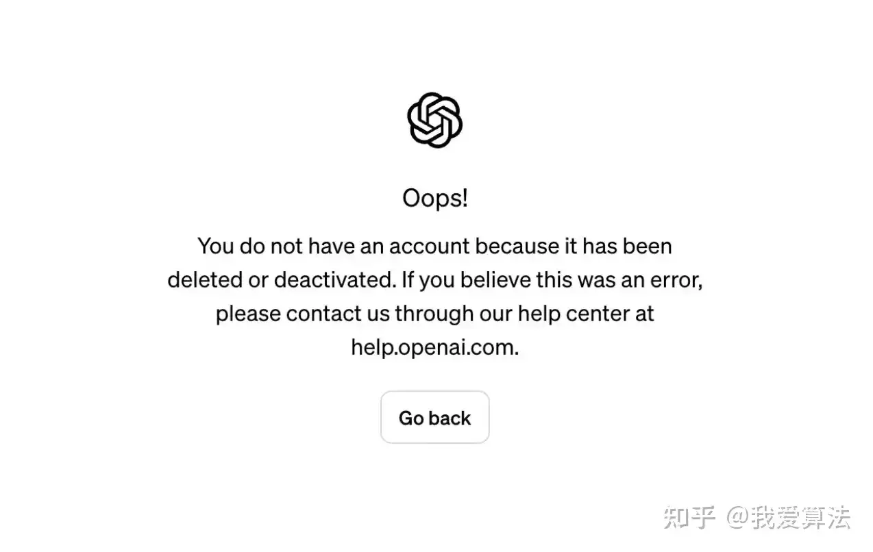 如果你看到这个画面,说明你的 ChatGPT 账号可能被删除或封禁,无法再使用。即使你尝试通过官方渠道进行申诉,恢复的可能性也不大。建议重新注册一个新账号。