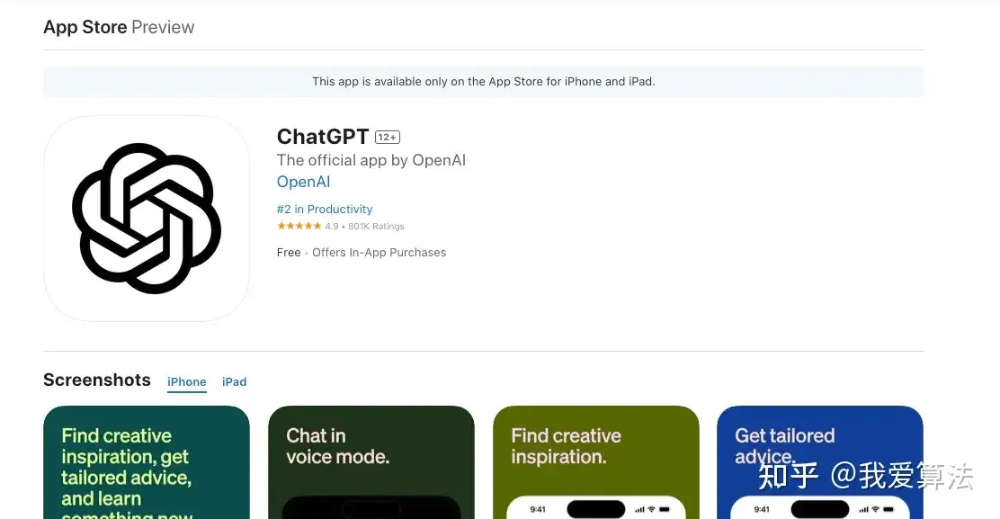 ChatGPT 的移动端应用只能在苹果系统的 App Store 中安装。许多人在搜索时可能会遇到假冒应用,确保找到标有 “The official app by OpenAI” 的正版应用。如果无法搜索到,可能是因为你的 Apple ID 需要切换到美区或港版。