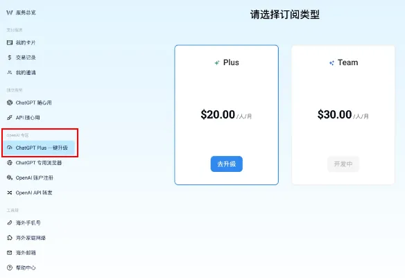 开通虚拟卡后,点击右侧导航栏的 ChatGPT Plus 一键升级。