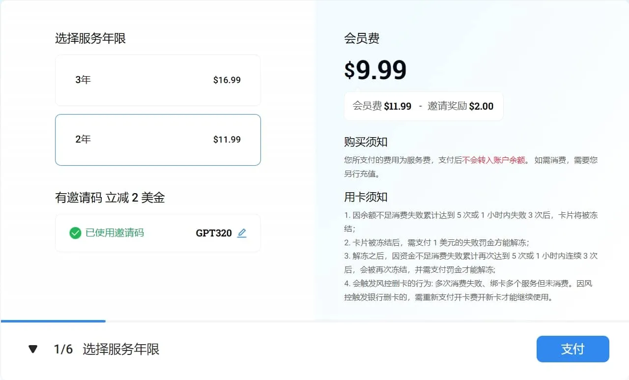 - 选择卡片的使用期限,使用我的邀请码🧧 ACCPAY 可以再减💲2美元。