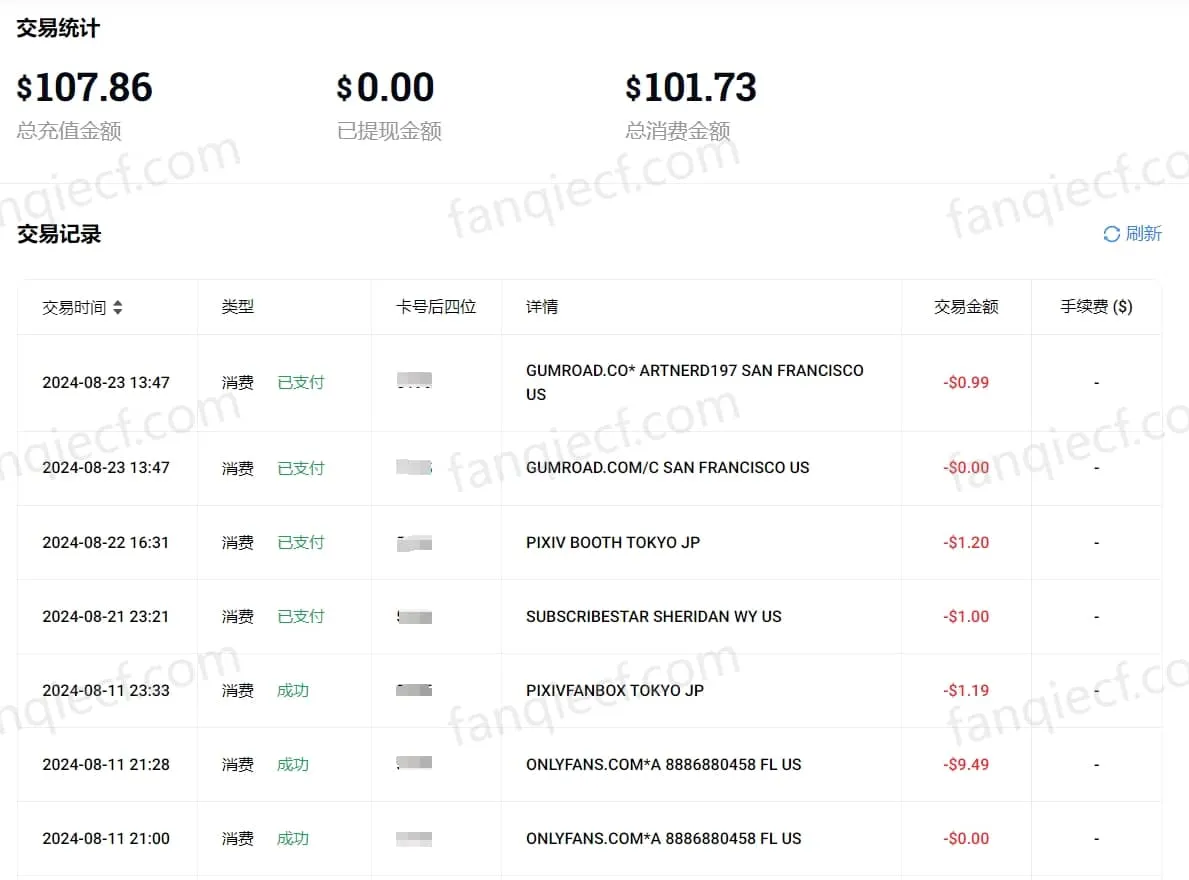 - 虚拟卡用于美元支付无手续费,但用于非美元支付时,平台会收取1%+$0.5的手续费,因此消费记录可能会高于预期。